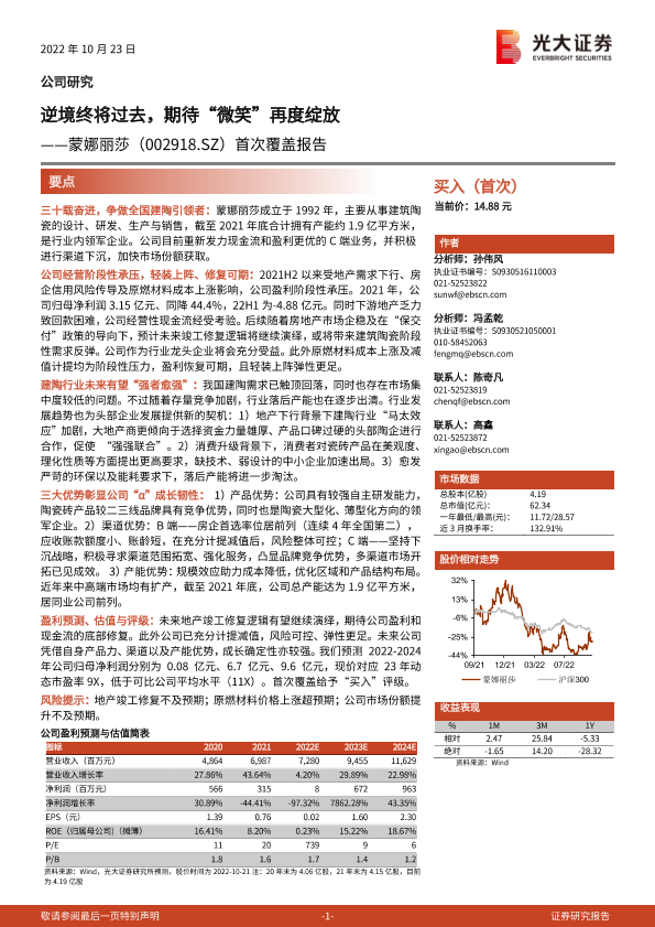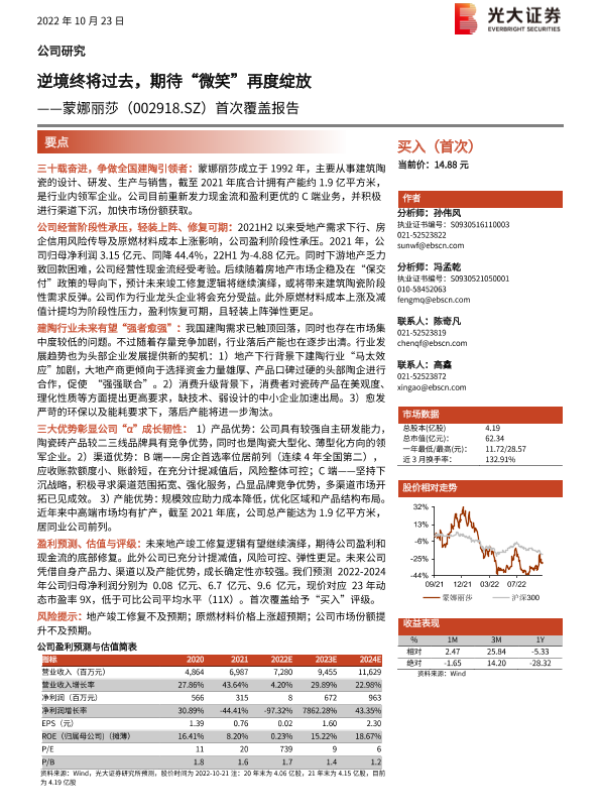 建筑陶瓷 蒙娜丽莎 行业分析 财务预测 首次覆盖报告