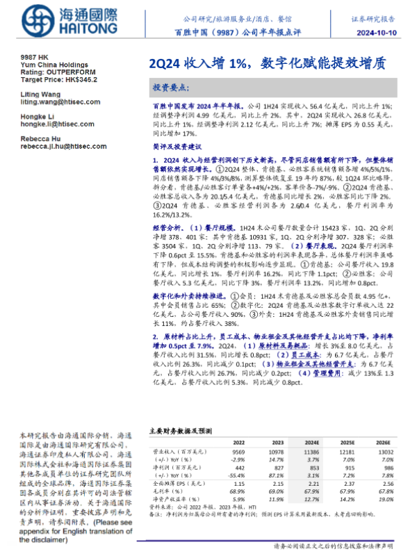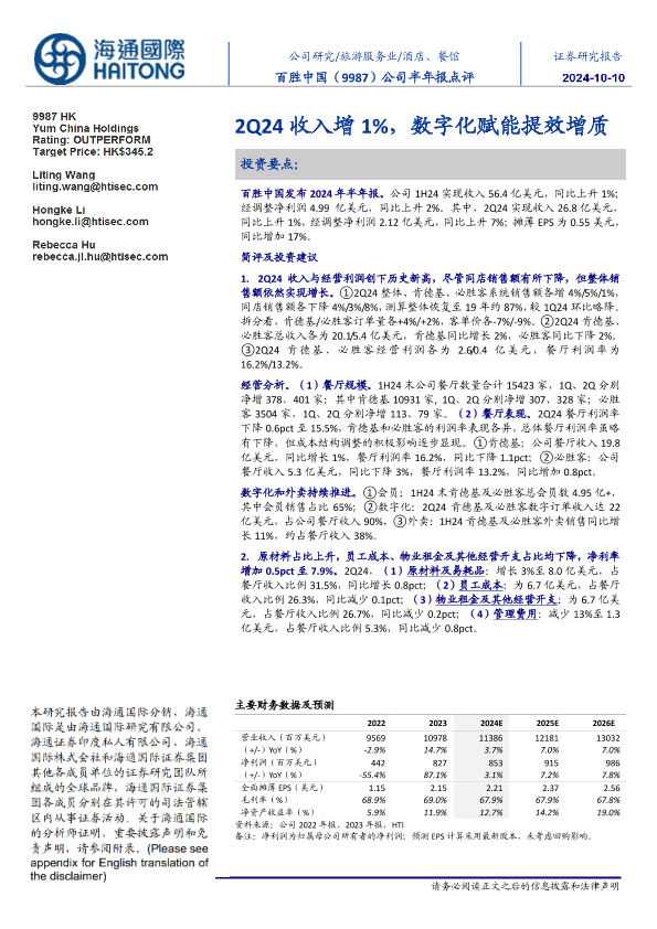【海通国际】【202410】百胜中国(09987.HK)公司半年报点评:2Q24收入增1%,数字化赋能提效增质-13页