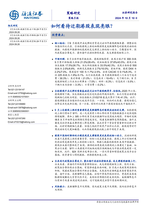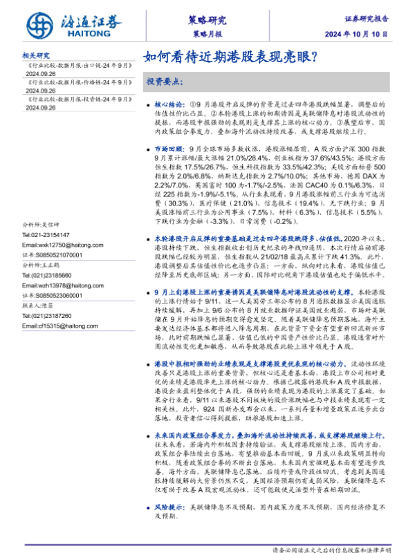 【海通证券】【202410】策略月报:如何看待近期港股表现亮眼?-11页