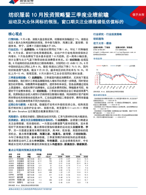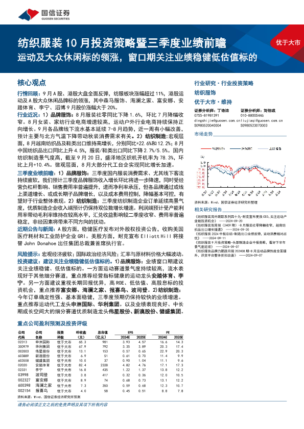 【国信证券】【20240930】纺织服装行业10月投资策略暨三季度业绩前瞻:运动及大众休闲标的领涨,窗口期关注业绩稳健低估值标的-23页
