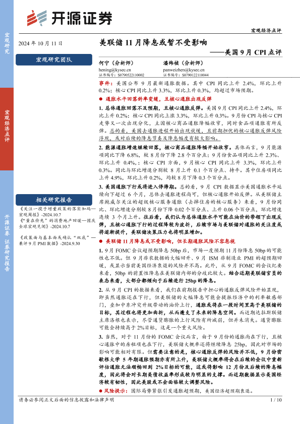 【开源证券】【20241011】美国9月CPI点评:美联储11月降息或暂不受影响-10页