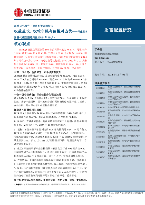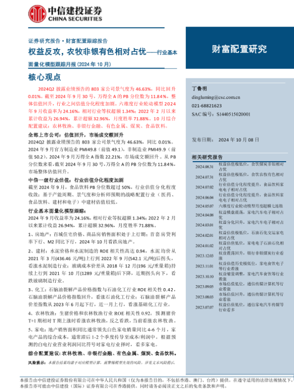 【中信建投证券】【20241008】行业基本面量化模型跟踪月报(2024年10月):权益反攻,农牧非银有色相对占优-22页