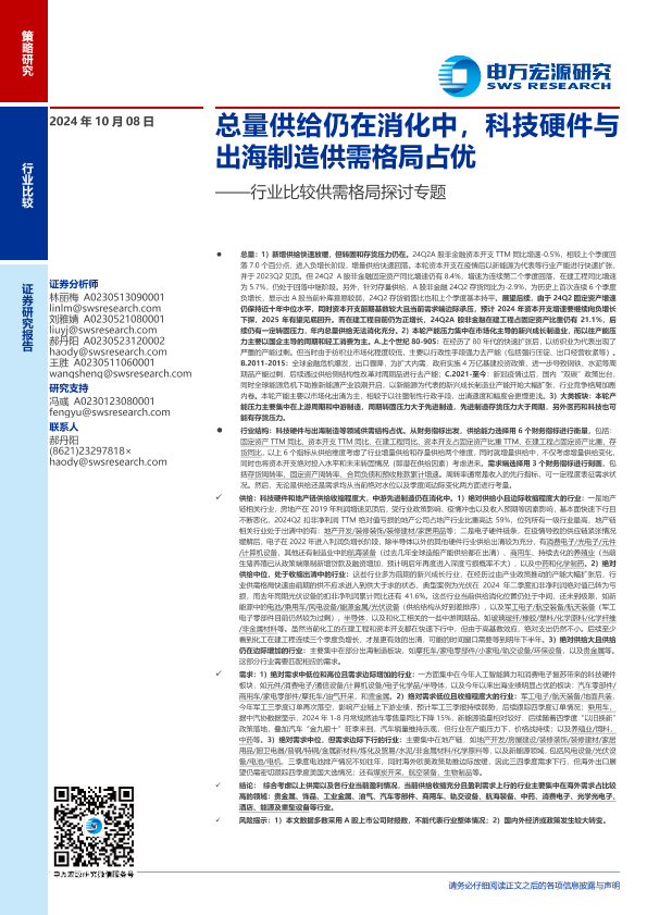 【申万宏源】【20241008】行业比较供需格局探讨专题:总量供给仍在消化中,科技硬件与出海制造供需格局占优-20页