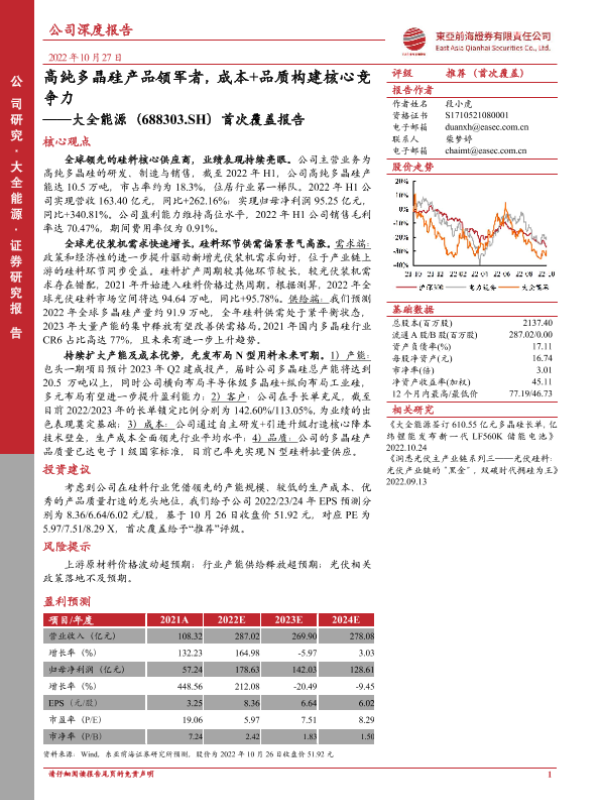 【东亚前海证券】【20221027】首次覆盖报告:高纯多晶硅产品领军者,成本+品质构建核心竞争力-31页