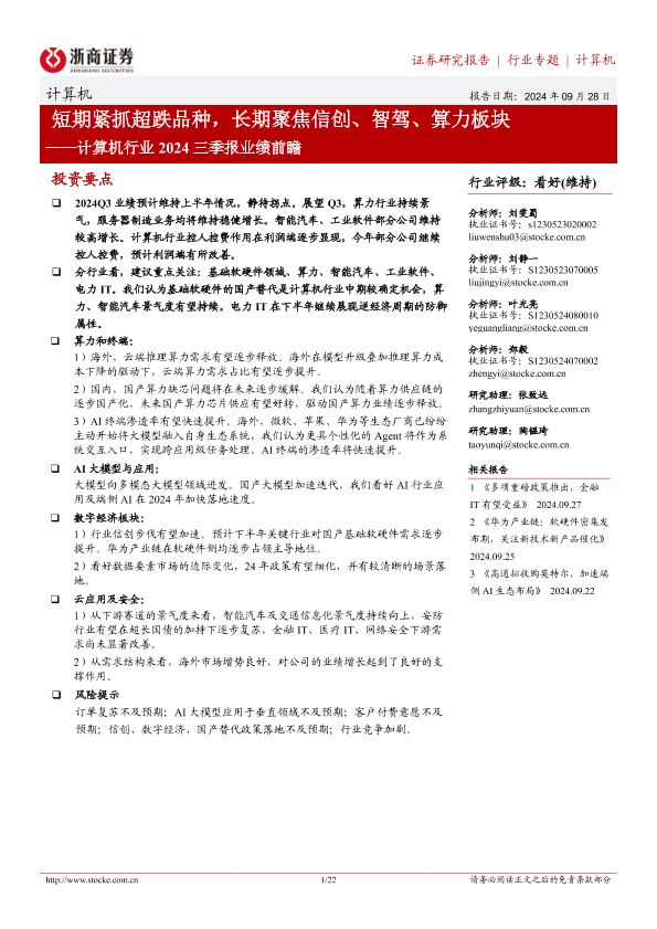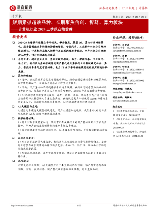 【浙商证券】【20240928】计算机行业2024三季报业绩前瞻:短期紧抓超跌品种,长期聚焦信创、智驾、算力板块-22页