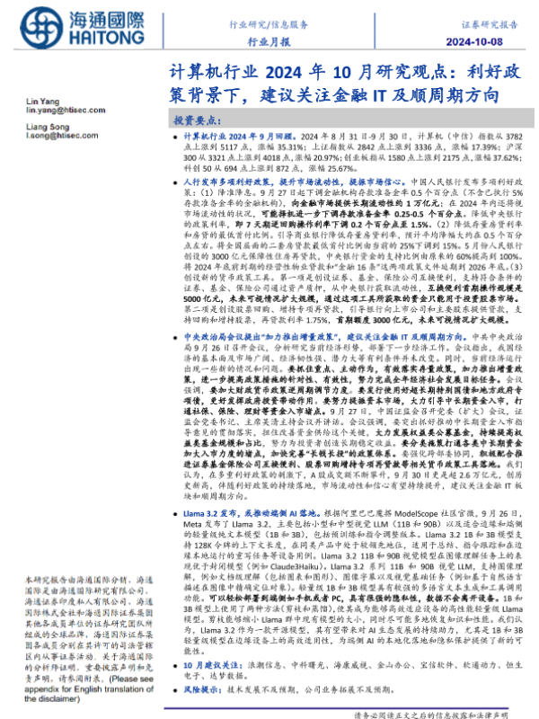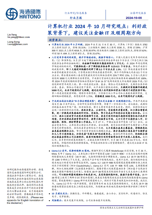 【海通国际】【20241008】计算机行业2024年10月研究观点:利好政策背景下,建议关注金融IT及顺周期方向-11页
