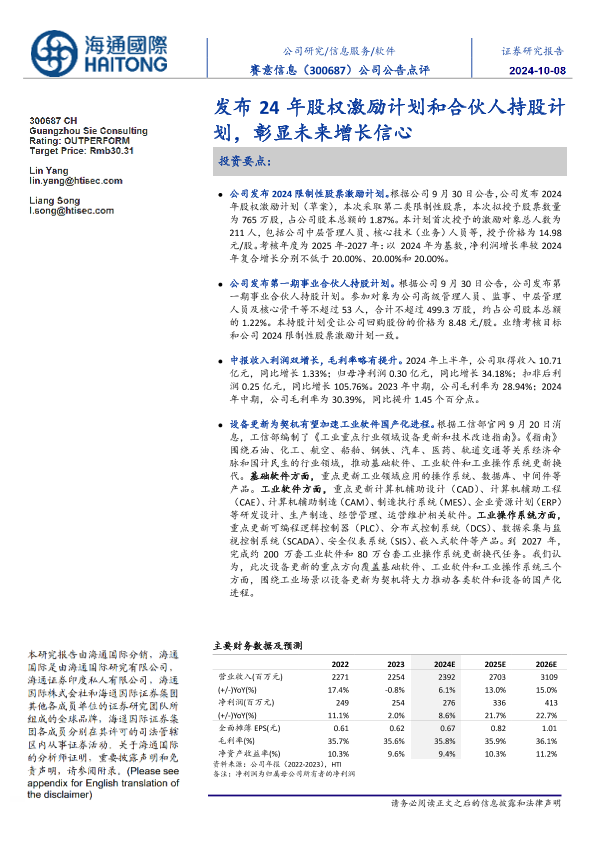 【海通国际】【20241008】赛意信息(300687)公司公告点评:发布24年股权激励计划和合伙人持股计划,彰显未来增长信心-11页