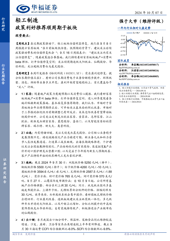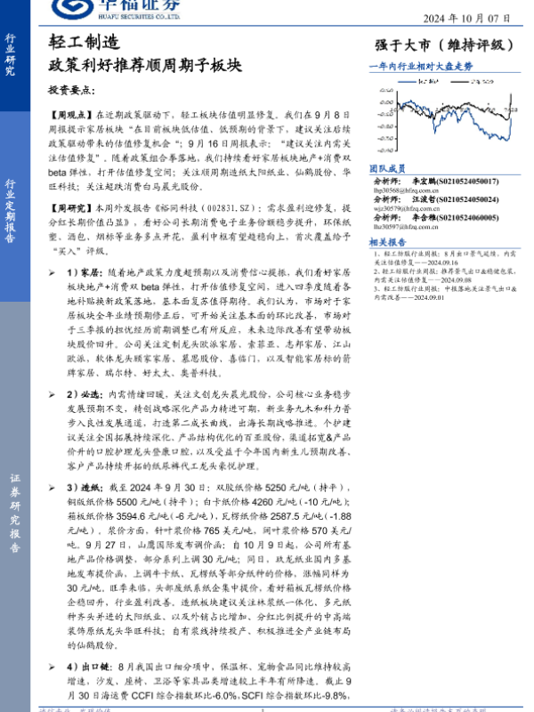 【华福证券】【20241007】轻工制造行业定期报告:政策利好推荐顺周期子板块-19页