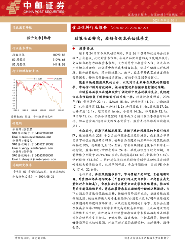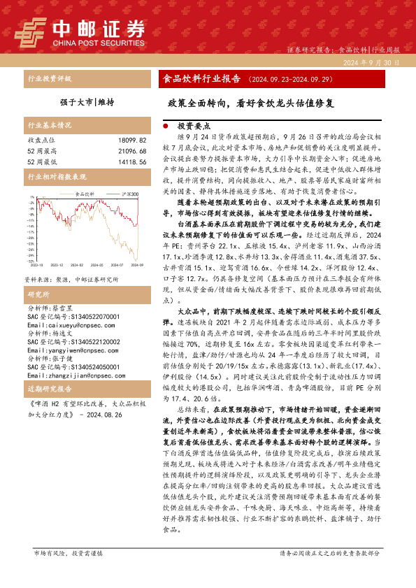【中邮证券】【20240930】食品饮料行业报告:政策全面转向,看好食饮龙头估值修复-24页