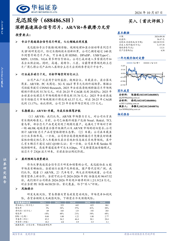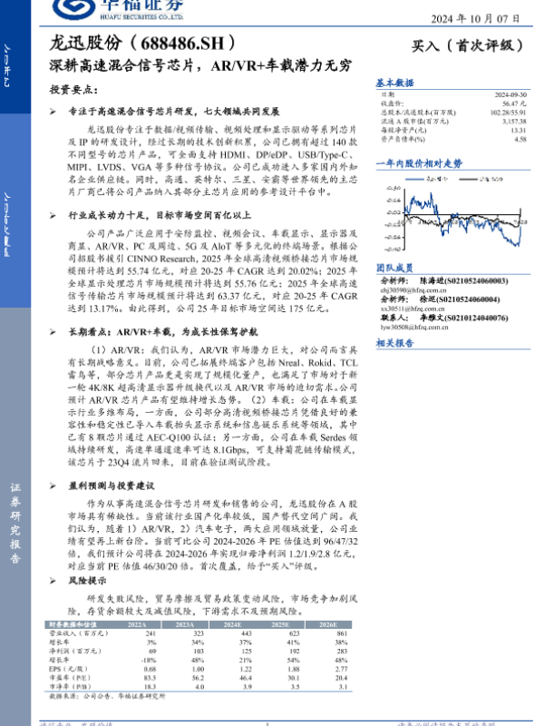 【华福证券】【20241007】龙迅股份(688486)深耕高速混合信号芯片,AR/VR+车载潜力无穷-23页