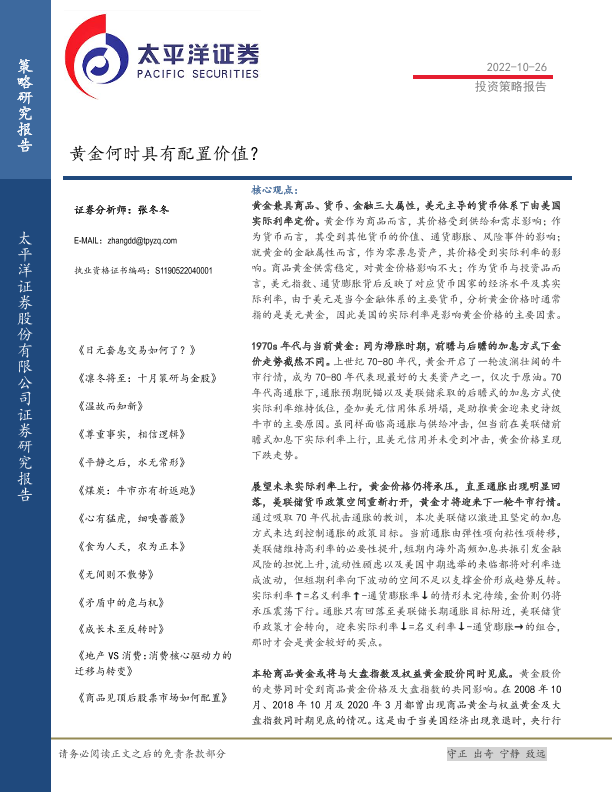 【太平洋证券】【20221026】黄金何时具有配置价值?-20页