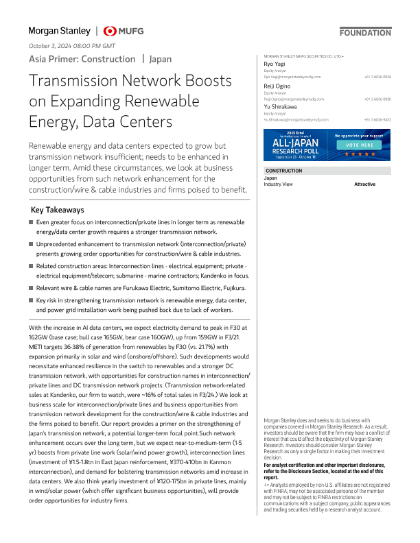 【Morgan Stanley】【2024】Asia Primer Construction | Japan Transmission Network Boosts on Expanding Renewable Energy, Data Centers-53页