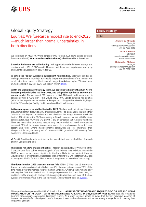 【UBS AG London Branch】【20241003】Global Equity Strategy Equities We forecast a modest rise to end-2025-34页