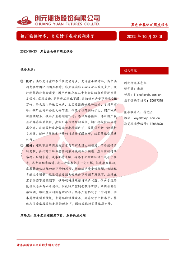 【创元期货】【20221023】黑色金属钢矿周度报告:钢厂检修增多,负反馈下成材利润修复-26页