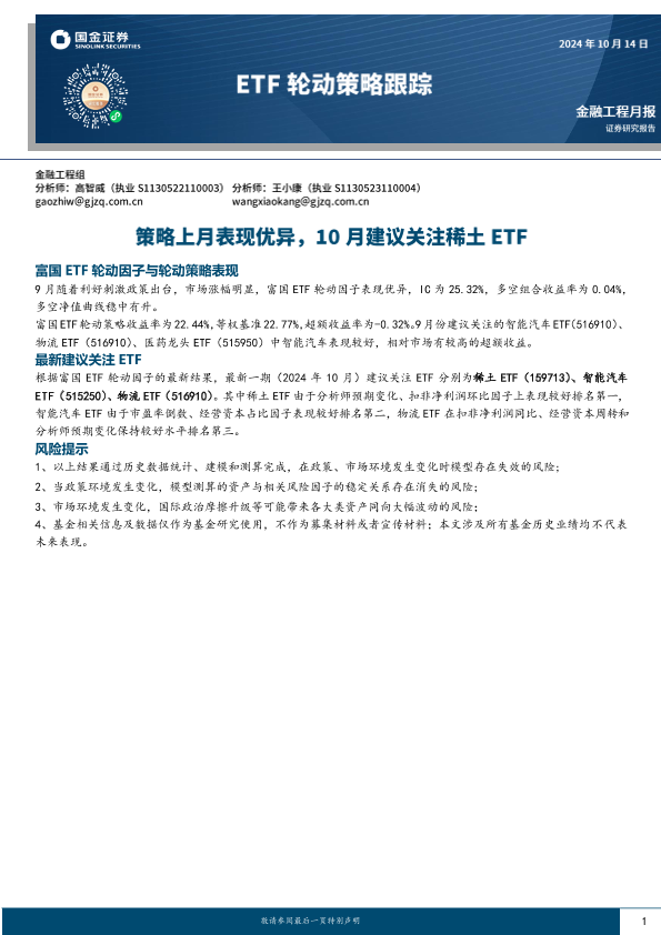 【国金证券】【202410】ETF轮动策略跟踪:策略上月表现优异,10月建议关注稀土ETF-10页