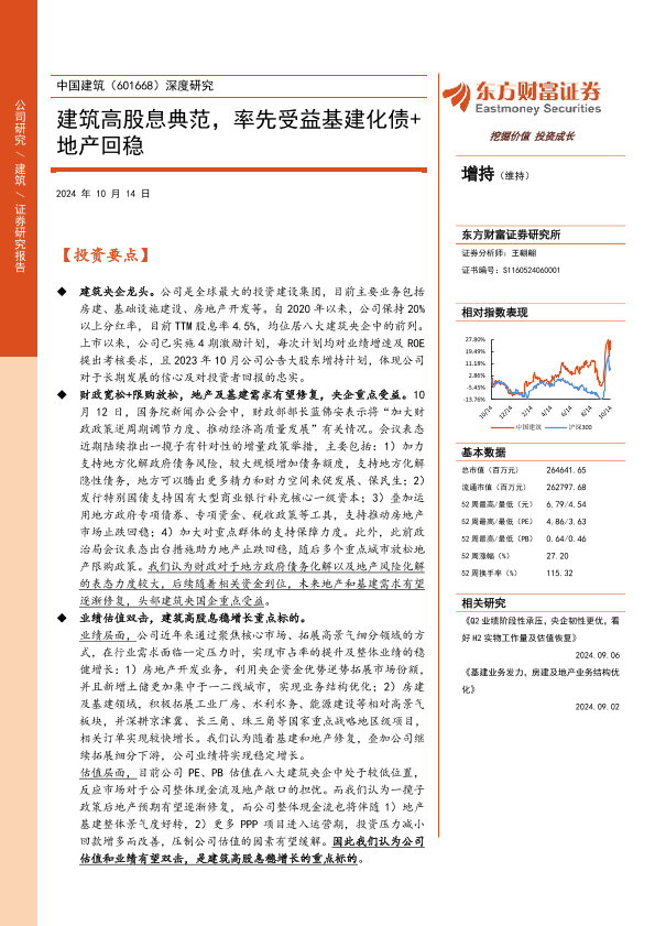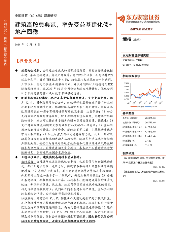 【东方财富证券】【20241014】中国建筑(601668)深度研究:建筑高股息典范,率先受益基建化债+地产回稳-26页