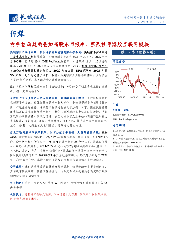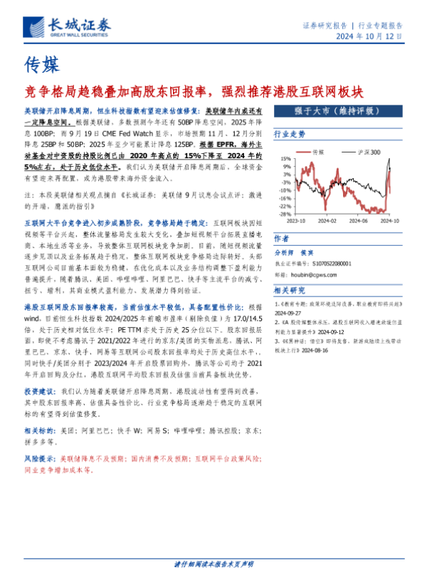 【长城证券】【20241012】传媒行业:竞争格局趋稳叠加高股东回报率,强烈推荐港股互联网板块-13页