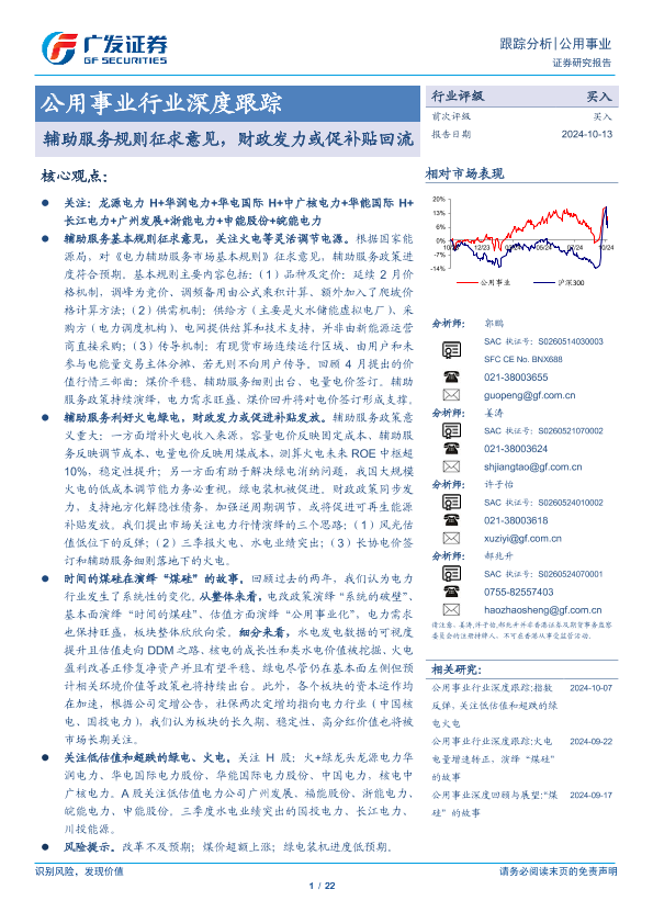 【广发证券】【20241013】公用事业行业深度跟踪,辅助服务规则征求意见,财政发力或促补贴回流-22页
