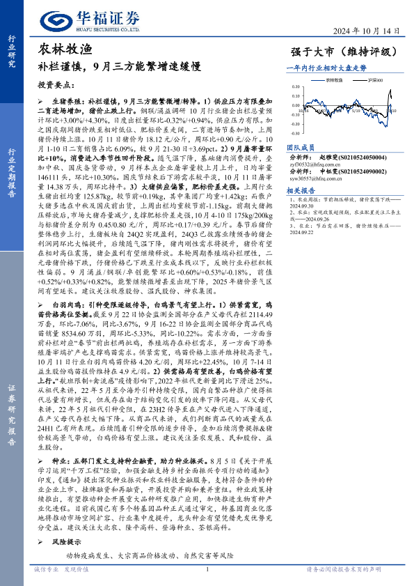 【华福证券】【20241014】农林牧渔行业定期报告:补栏谨慎,9月三方能繁增速缓慢-12页