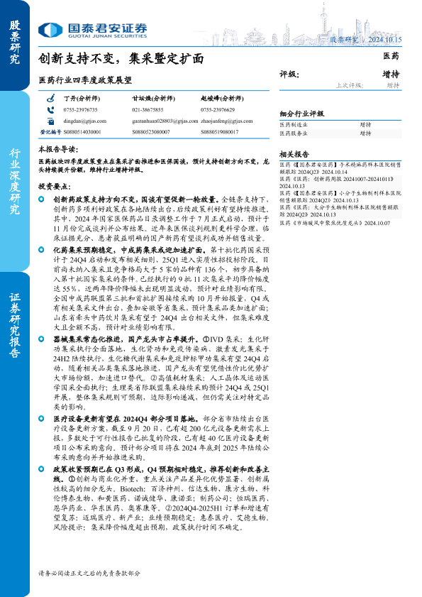 【国泰君安证券】【20241015】医药行业四季度政策展望:创新支持不变,集采暨定扩面-23页