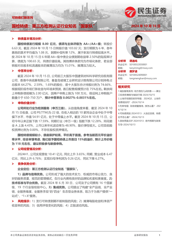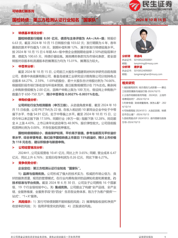 【民生证券】【20241016】可转债打新系列-国检转债:第三方检测认证行业知名“国家队”-16页