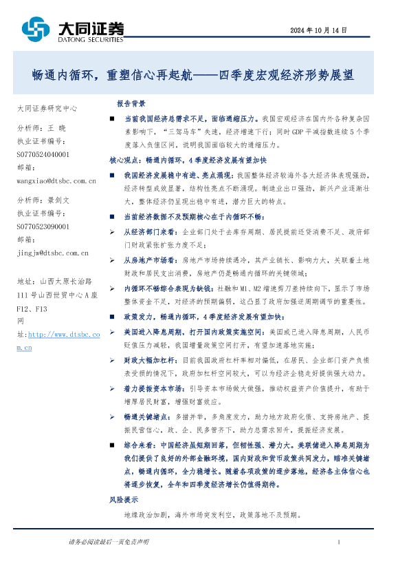 【大同证券】【20241014】四季度宏观经济形势展望:畅通内循环,重塑信心再起航-14页