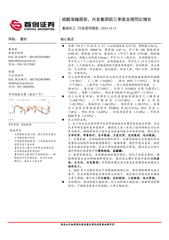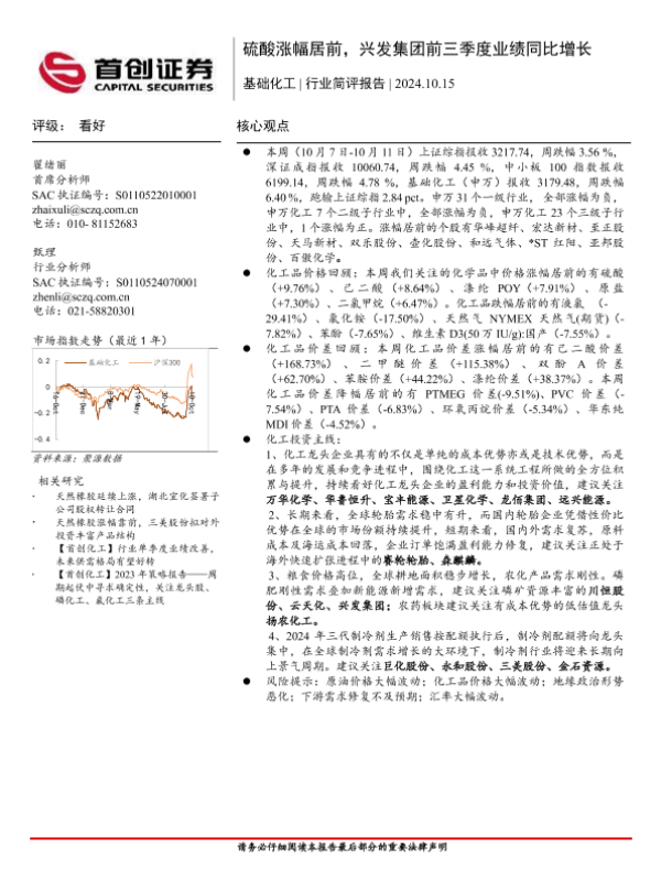 【首创证券】【20241015】基础化工行业简评报告:硫酸涨幅居前,兴发集团前三季度业绩同比增长-15页