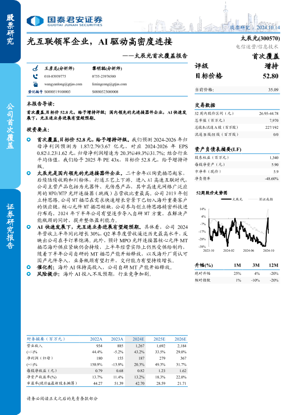 【国泰君安证券】【20241014】太辰光(300570)首次覆盖报告:光互联领军企业,AI驱动高密度连接-19页