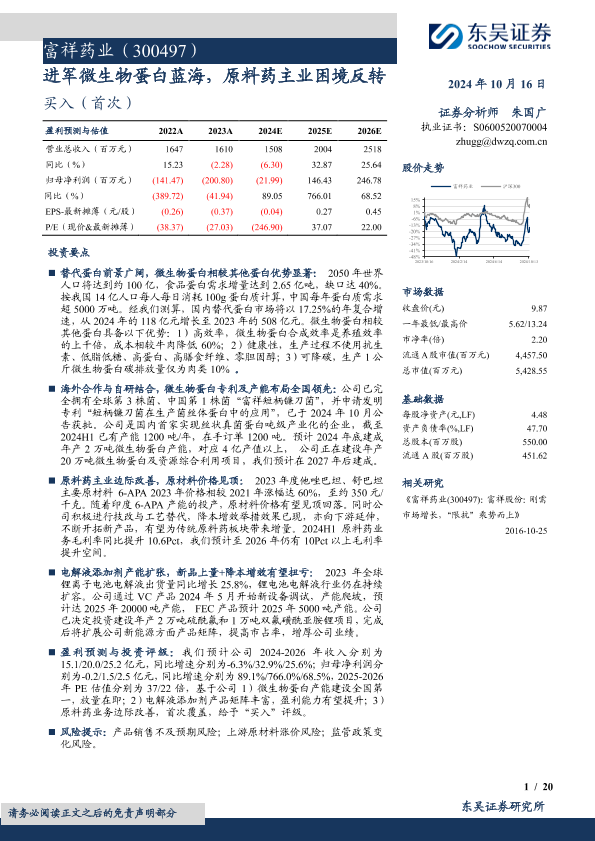 【东吴证券】【20241016】富祥药业(300497)进军微生物蛋白蓝海,原料药主业困境反转-20页
