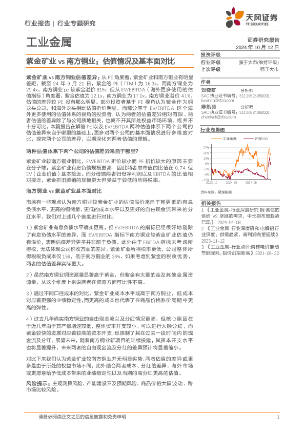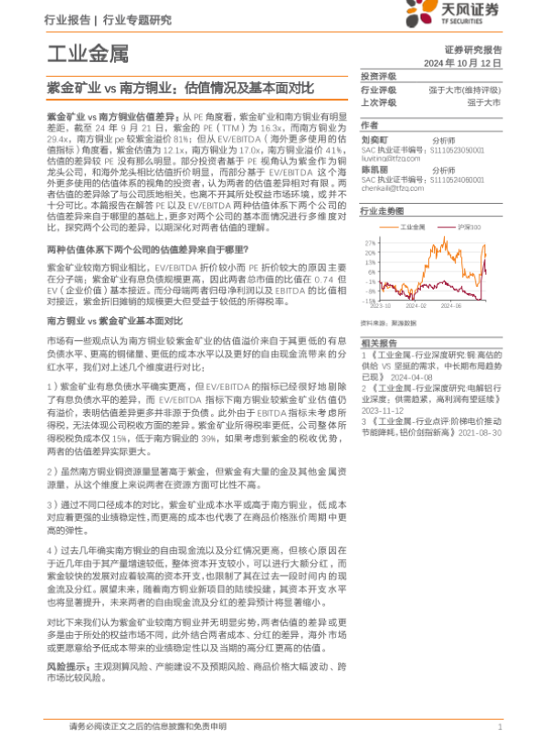 【天风证券】【20241012】工业金属行业专题研究:紫金矿业vs南方铜业,估值情况及基本面对比-11页