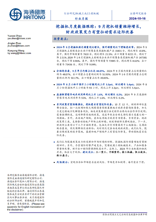 【海通国际】【20241016】工程机械行业挖掘机月度数据跟踪:9月挖机销量维持增长,财政政策发力有望拉动需求边际改善-10页