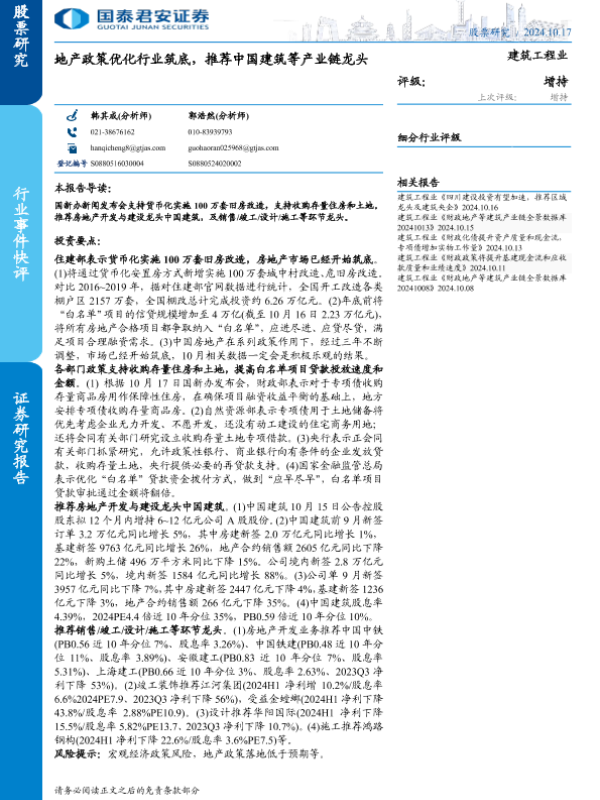 【国泰君安证券】【20241017】建筑工程行业:地产政策优化行业筑底,推荐中国建筑等产业链龙头-12页
