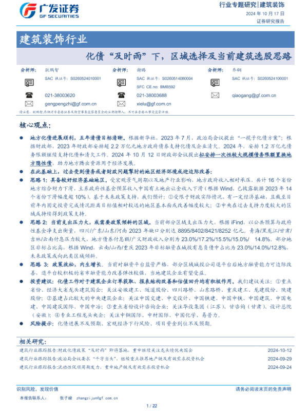 【广发证券】【20241017】建筑装饰行业:化债“及时雨”下,区域选择及当前建筑选股思路-22页