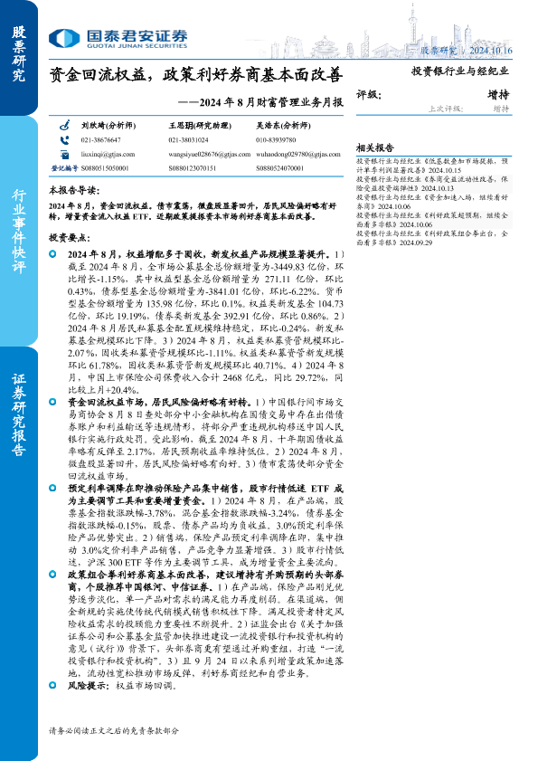 【国泰君安证券】【20241016】投资银行业与经纪业行业2024年8月财富管理业务月报:资金回流权益,政策利好券商基本面改善-13页