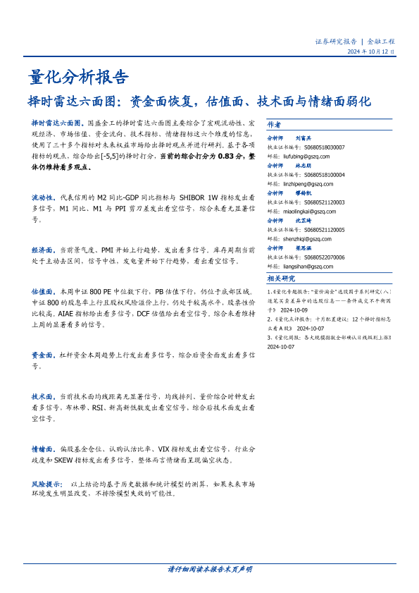 【国盛证券】【20241012】择时雷达六面图:资金面恢复,估值面、技术面与情绪面弱化-23页