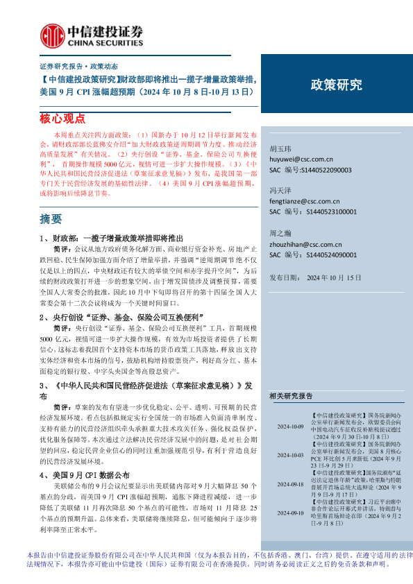 【中信建投证券】【20241015】政策研究:财政部即将推出一揽子增量政策举措,美国9月CPI涨幅超预期-14页