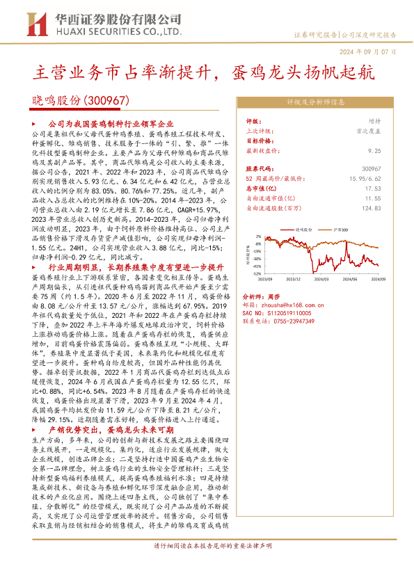 【华西证券】【20240907】晓鸣股份(300967)主营业务市占率渐提升,蛋鸡龙头扬帆起航-26页