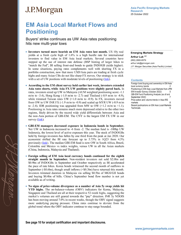 【J.P. Morgan】【20221025】EM Asia Local Market Flows and Positioning Buyers strike continues as UW Asia rates positioning hits new multi-year lows-14页