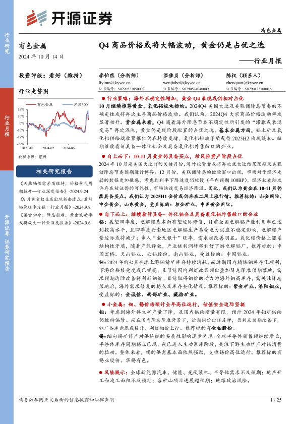 【开源证券】【20241014】有色金属行业月报:Q4商品价格或将大幅波动,黄金仍是占优之选-25页