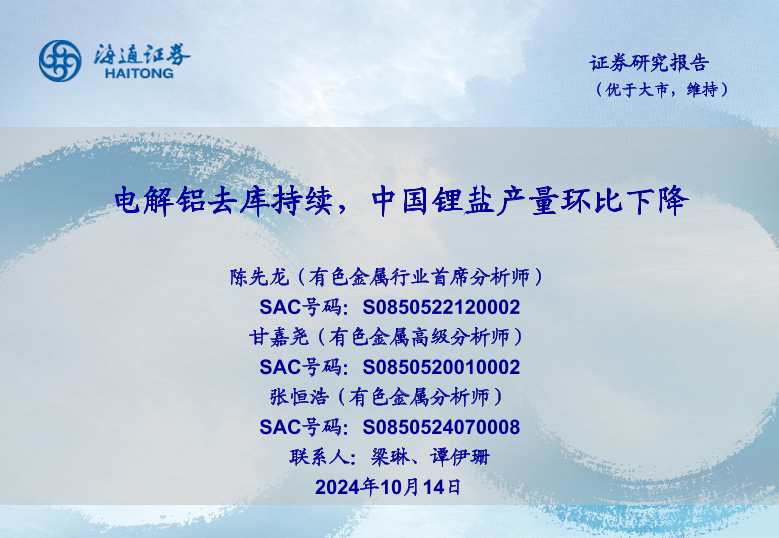 【海通证券】【20241014】有色金属行业:电解铝去库持续,中国锂盐产量环比下降-25页