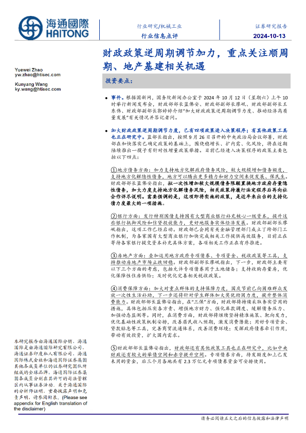 【海通国际】【20241012】机械工业行业信息点评:财政政策逆周期调节加力,重点关注顺周期、地产基建相关机遇-10页