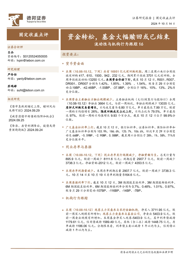 【德邦证券】【20241014】流动性与机构行为跟踪16:资金转松,基金大幅赎回或已结束-20页