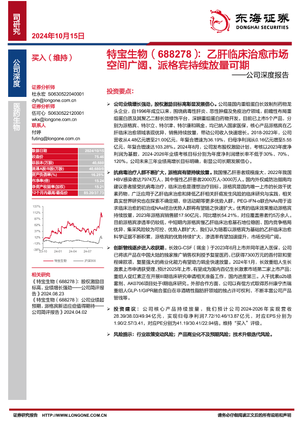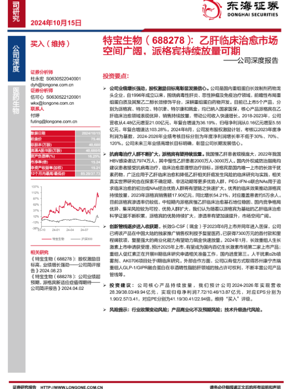【东海证券】【20241015】特宝生物(688278)公司深度报告:乙肝临床治愈市场空间广阔,派格宾持续放量可期-28页