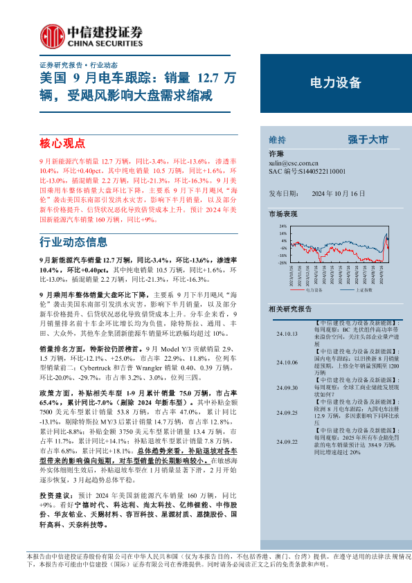 【中信建投证券】【20241016】电力设备行业美国9月电车跟踪:销量12.7万辆,受飓风影响大盘需求缩减-13页
