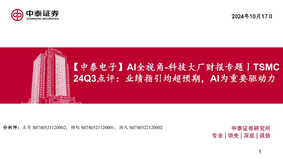 【中泰证券】【20241017】电子行业AI全视角-科技大厂财报专题|TSMC24Q3点评:业绩指引均超预期,AI为重要驱动力-20页