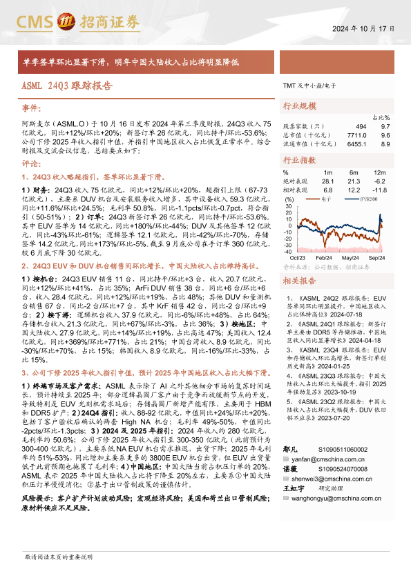 【海通证券】【20241017】电子行业ASML 24Q3跟踪报告:单季签单环比显著下滑,明年中国大陆收入占比将明显降低-10页