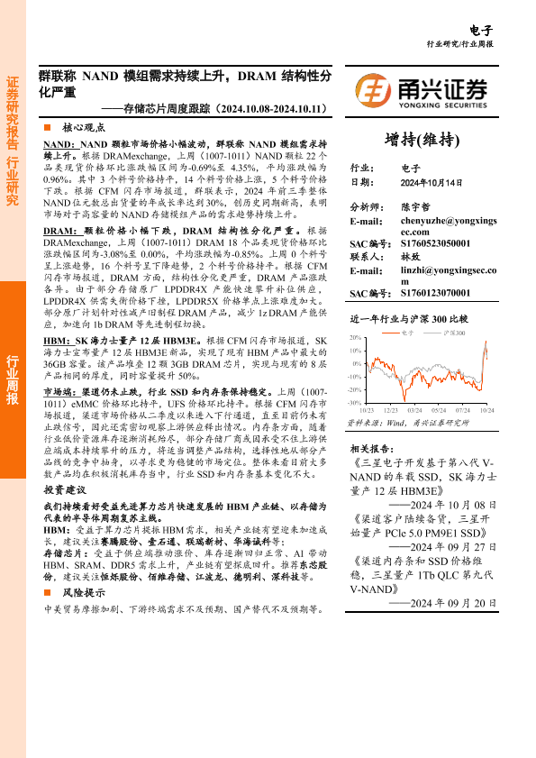 【甬兴证券】【20241014】电子行业存储芯片周度跟踪:群联称NAND模组需求持续上升,DRAM结构性分化严重-10页