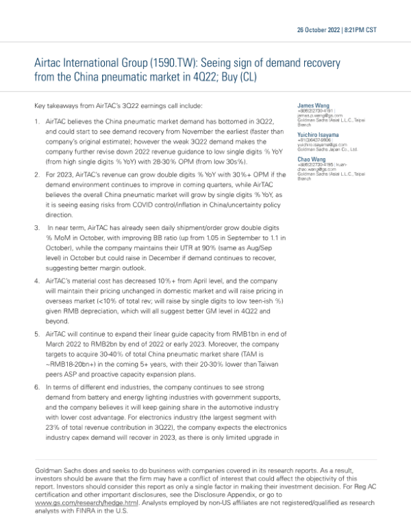 【Goldman Sachs】【20221026】Seeing sign of demand recovery from the China pneumatic market in 4Q22; Buy (CL)-10页