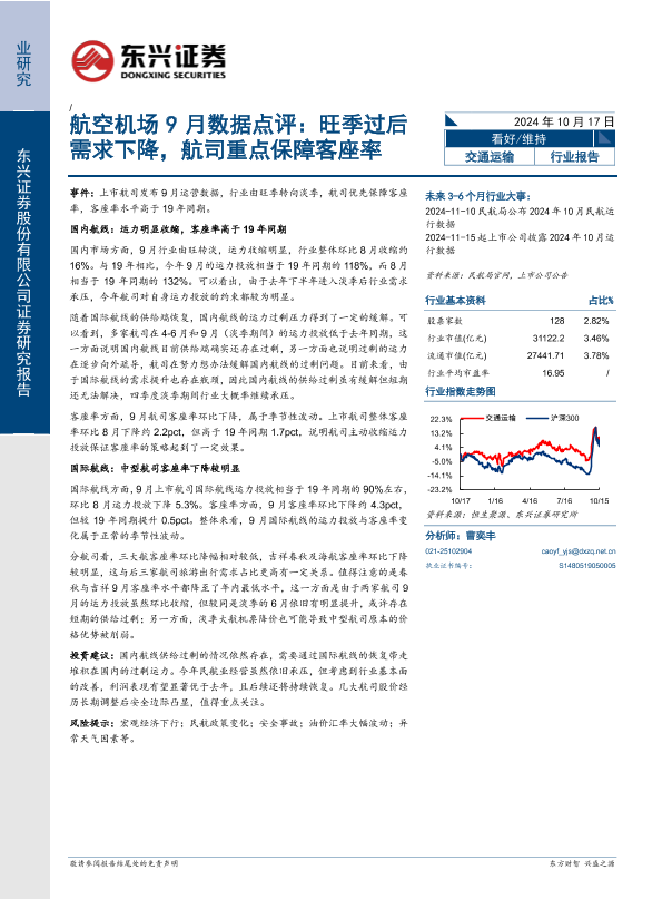 【东兴证券】【20241017】航空机场行业9月数据点评:旺季过后需求下降,航司重点保障客座率-11页