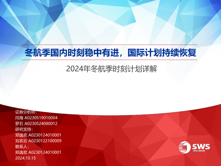 【申万宏源】【20241015】航空行业2024年冬航季时刻计划详解:冬航季国内时刻稳中有进,国际计划持续恢复-22页
